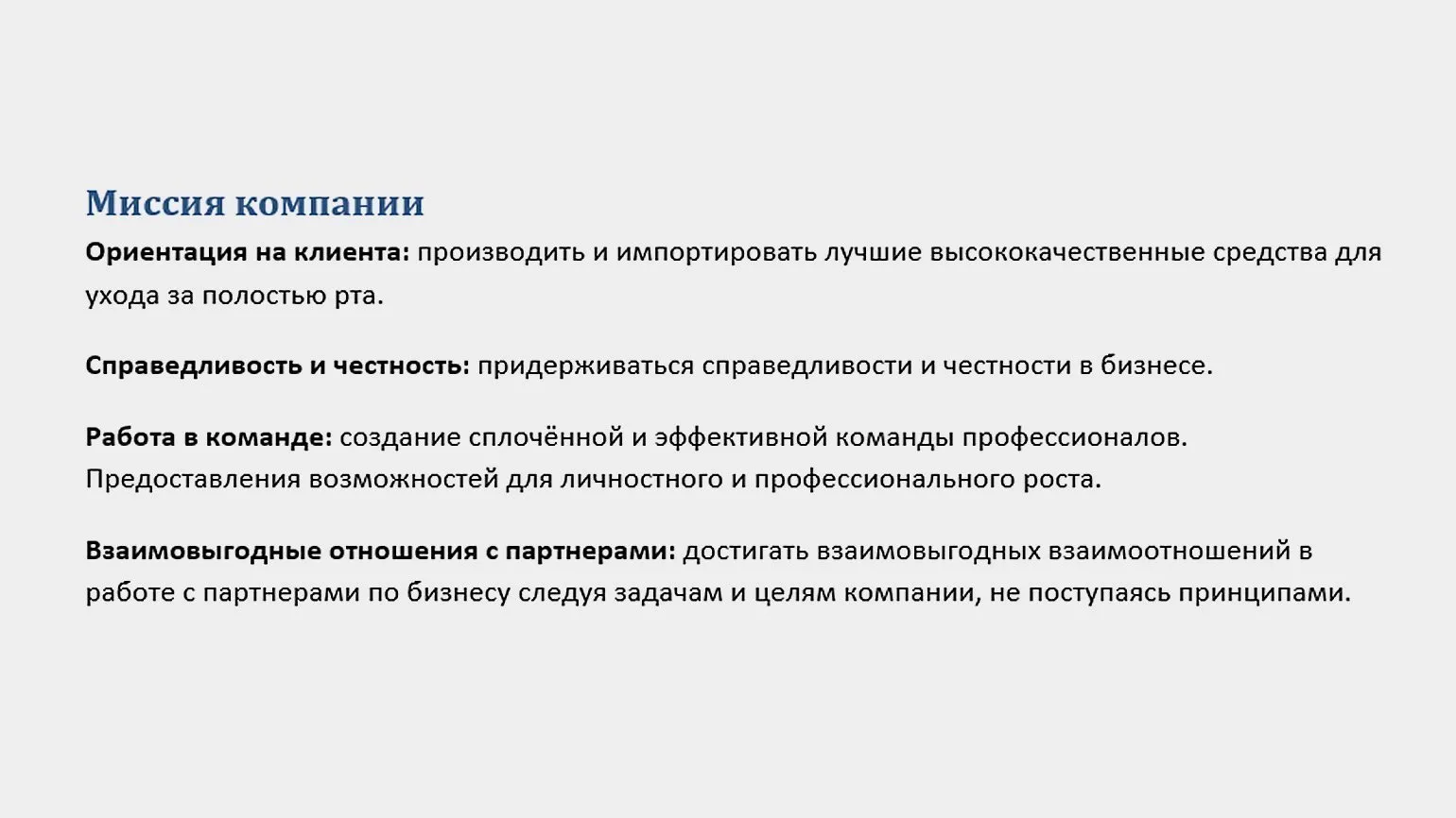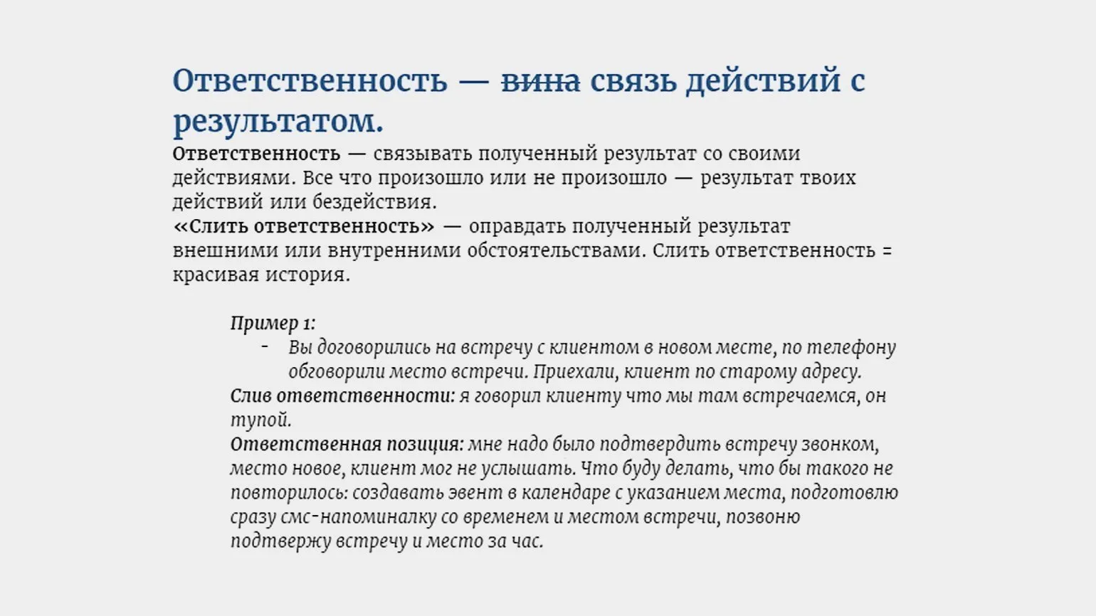 Лучше подумать о другом. Собственник создавал компанию с какой-то целью, и в ходе работы компания обросла принципами принятия решений и правилами коммуникации внутри коллектива. Именно об этом нужно рассказать новым сотрудникам: «Ребята, мы работаем вот так, оргструктура у нас такая, решения принимаются так, сюда мы идём, а туда нет. Такое мы принимаем, а такое ни в коем случае. Пожелания клиентов выполняем вот так или вот так».