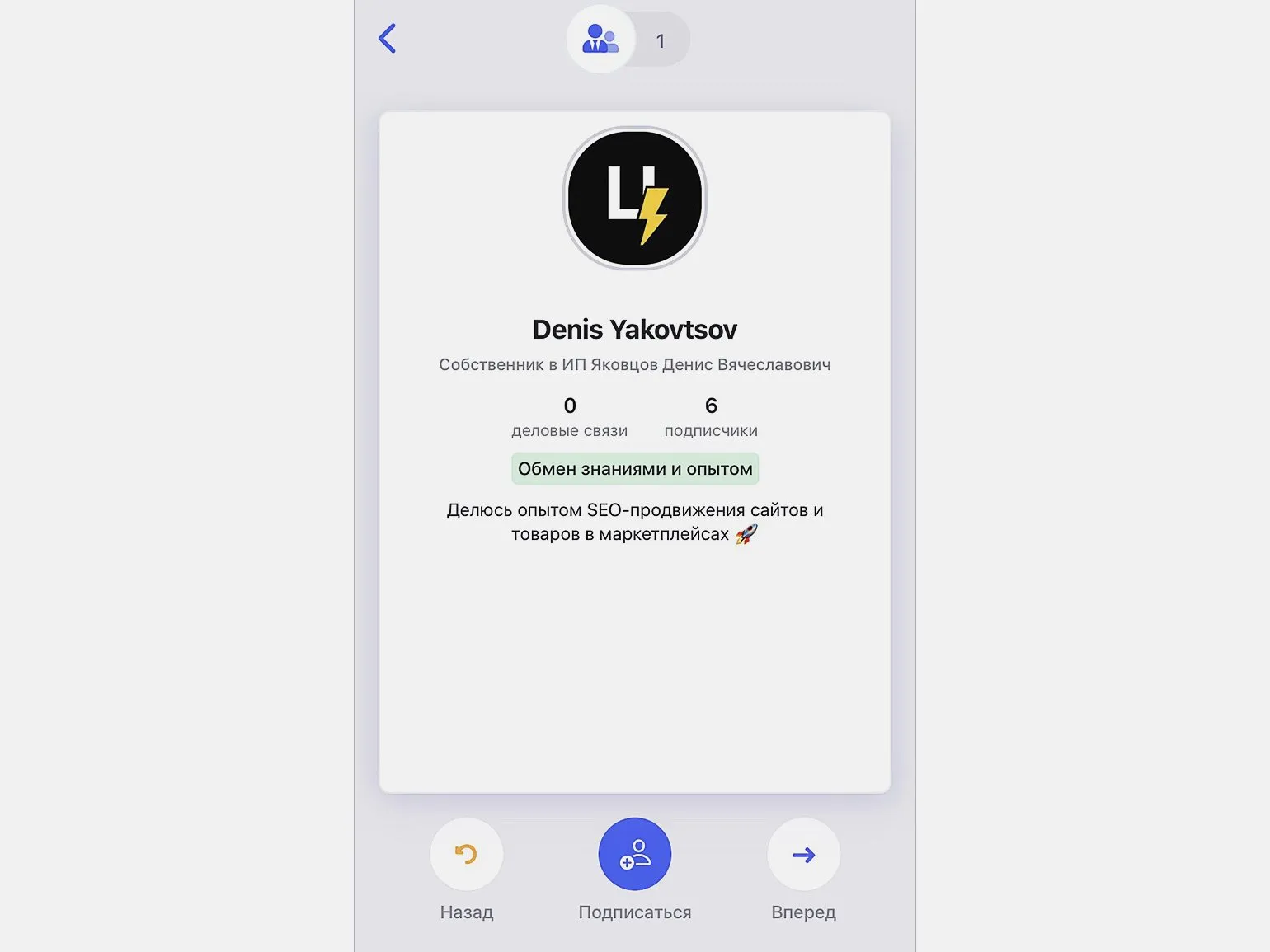 При регистрации в TenChat пользователь указывает свои интересы: профессиональные и хобби. На их основе алгоритм подбирает «партнёров». «Бизнес.Тиндер» показывает карточки пользователей — можно подписаться на них или свайпнуть в сторону и отказаться от подписки. Это удобный способ привлечь первые «деловые связи».