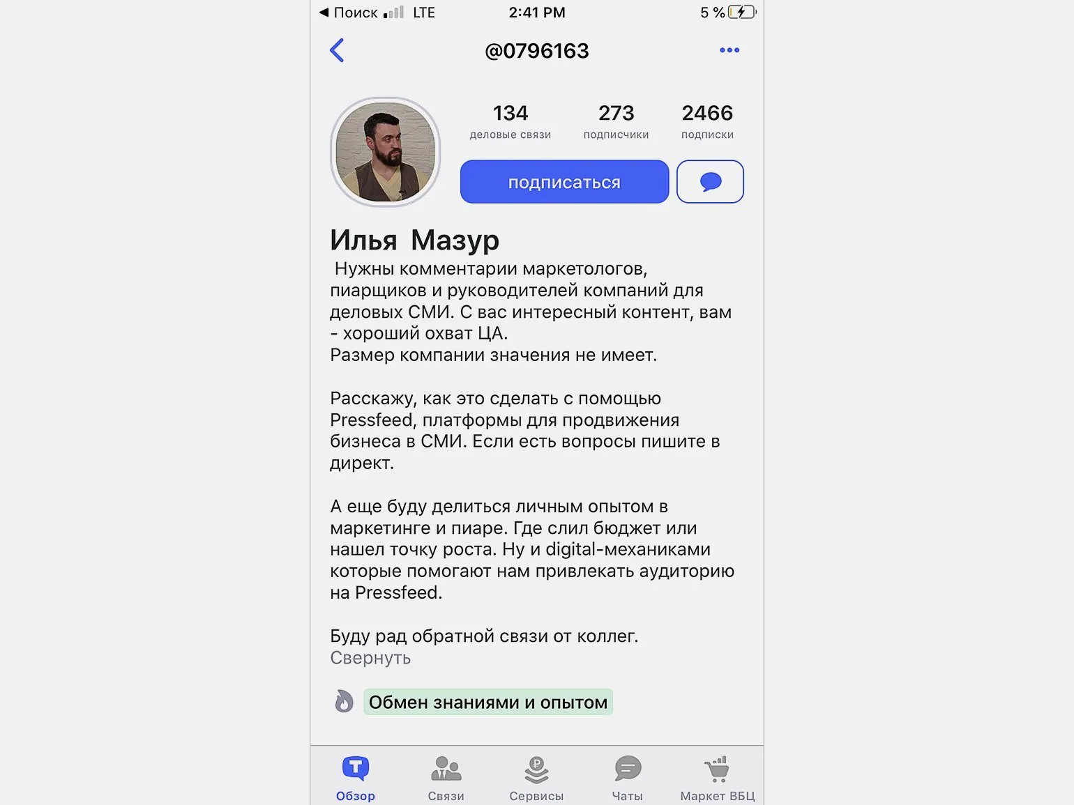 Подписки и подписчики. Пользователи могут подписываться друг на друга. Аналог друзей на платформе, то есть взаимная подписка, называется «деловые связи». Также у пользователя могут быть подписки — аккаунты, за которыми он следит, но они не подписаны на него, и подписчики, которых он не добавил в «деловые связи».